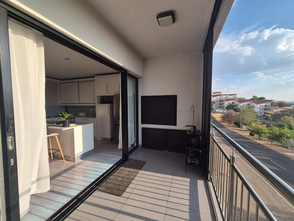 Open-plan kitchen and living area leading to a balcony with a built-in braai
